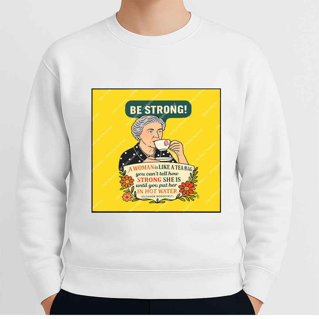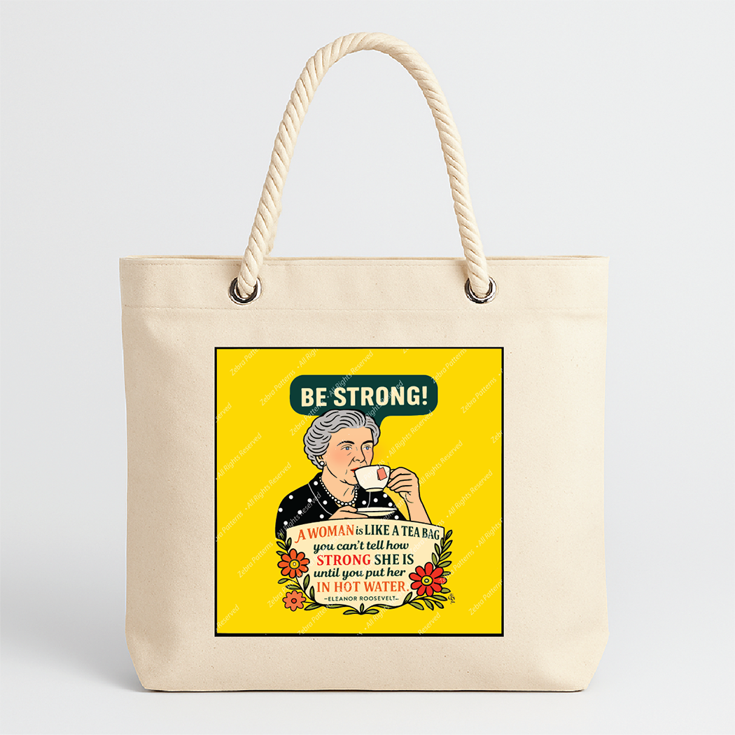 This bold 9 ”x 9” 100% cotton fabric art panel honors Eleanor Roosevelt with her witty and wise quote: “A woman is like a tea bag—you can’t tell how strong she is until you put her in hot water.” The message bubble reads “Be Strong!” — a reminder of inner strength and grace under pressure. (Part of the Women’s Quotes Panel series.)