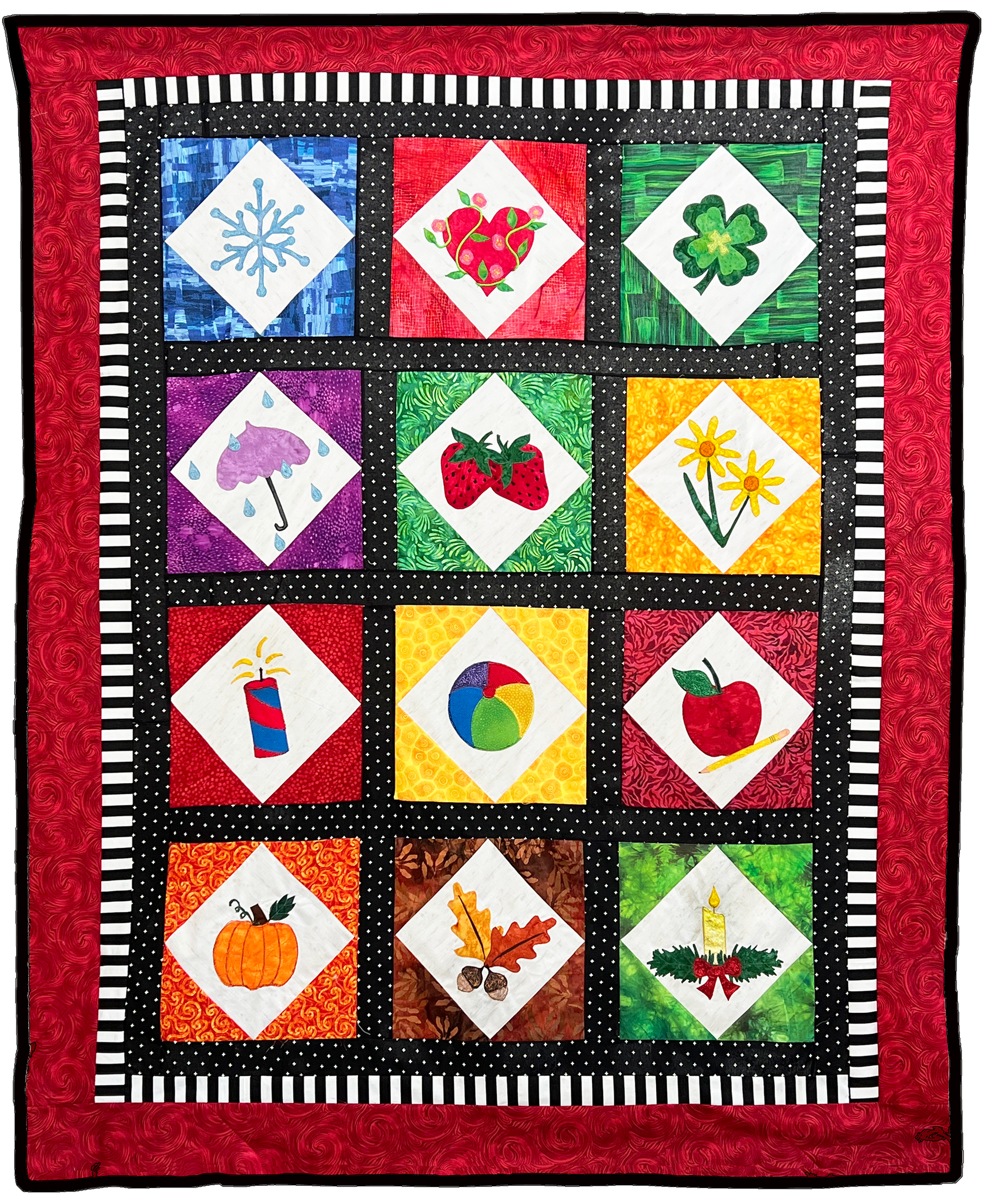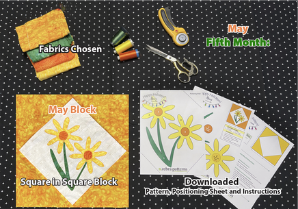 See image for the block put together with cotton fabrics. I chose a light background with matching corners to my design. My background will be the same for all twelve blocks. Your download will include a full size pattern, a positioning sheet and directions to create the background square in square block to place the featured image.