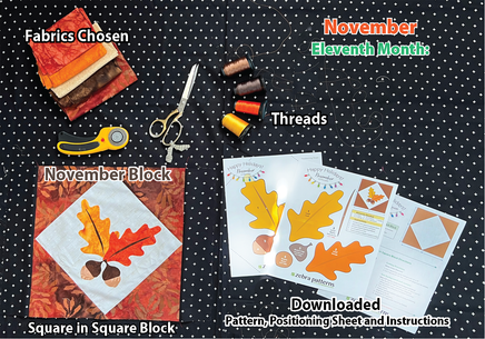 Those November Leaves are sure dazzling before falling to the ground, at which time no one wants to see them again! Preserve them at their very best in a beautifully bright Fall wallhanging quilt.